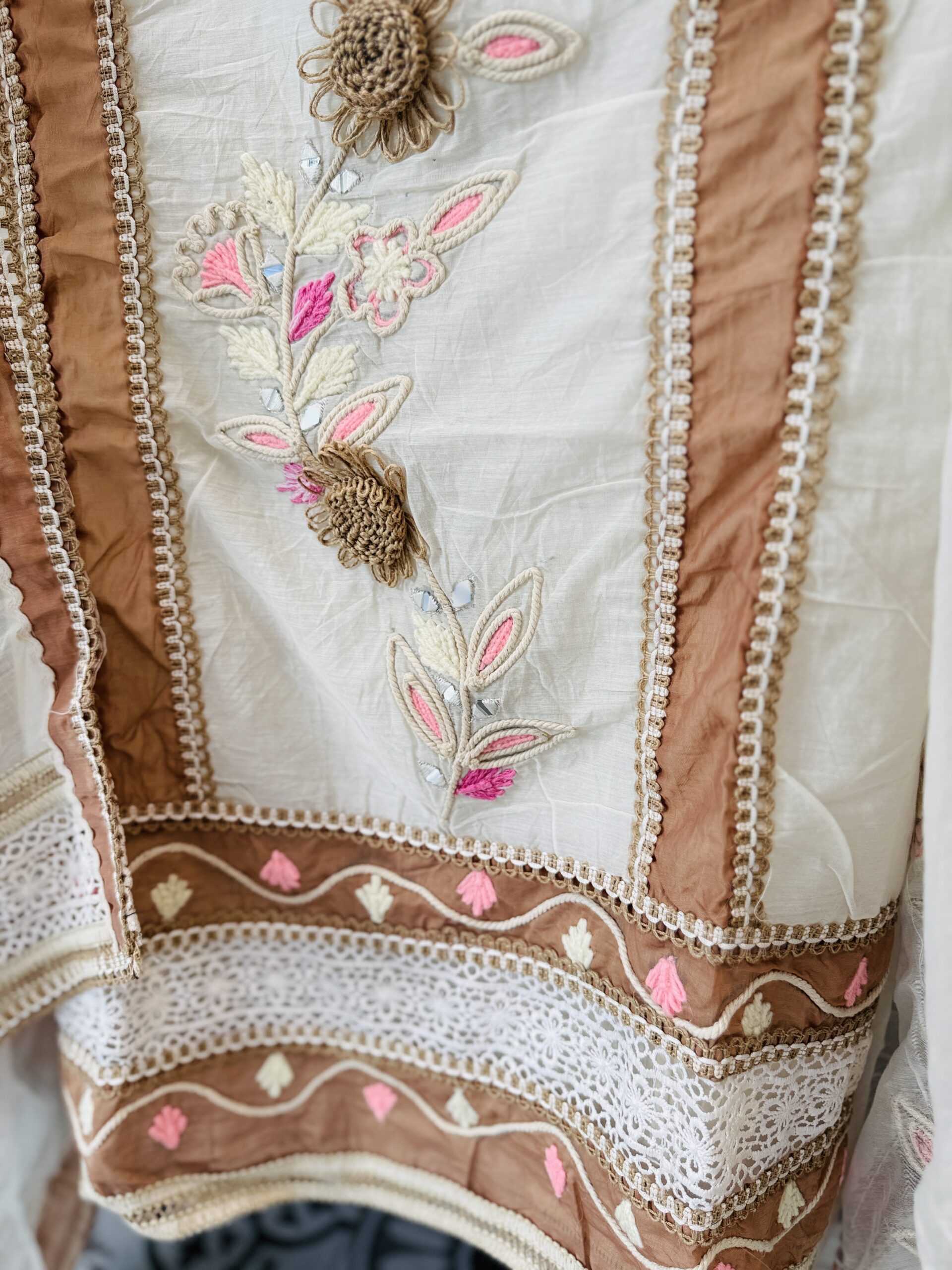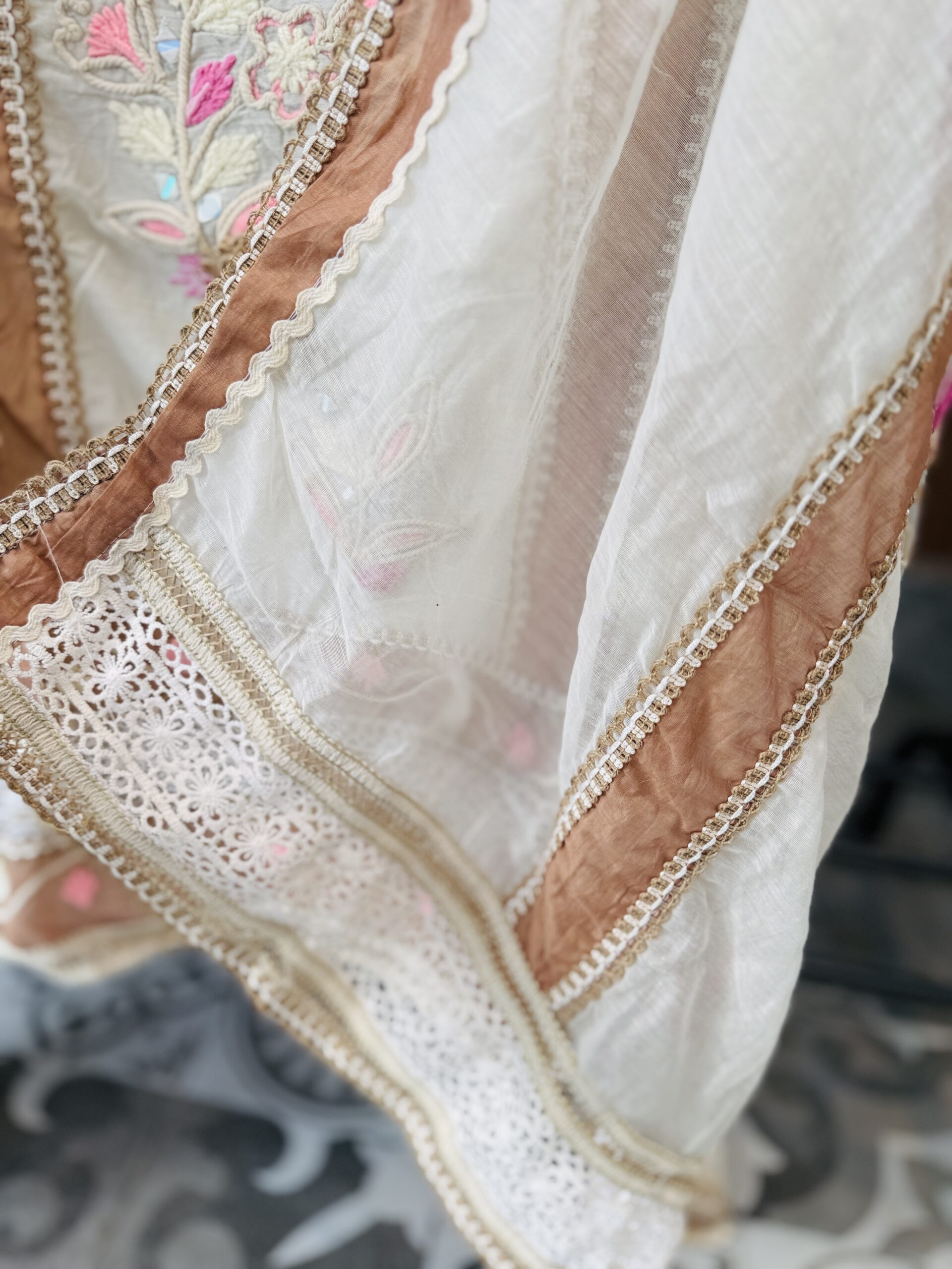• Dupatta: Off-white dupatta with broad brown satin borders and lace edging, enhancing the ethnic look