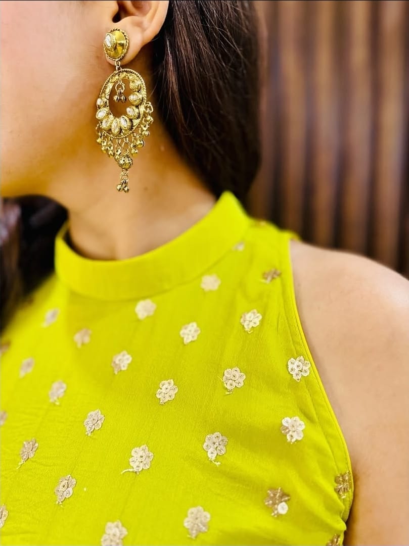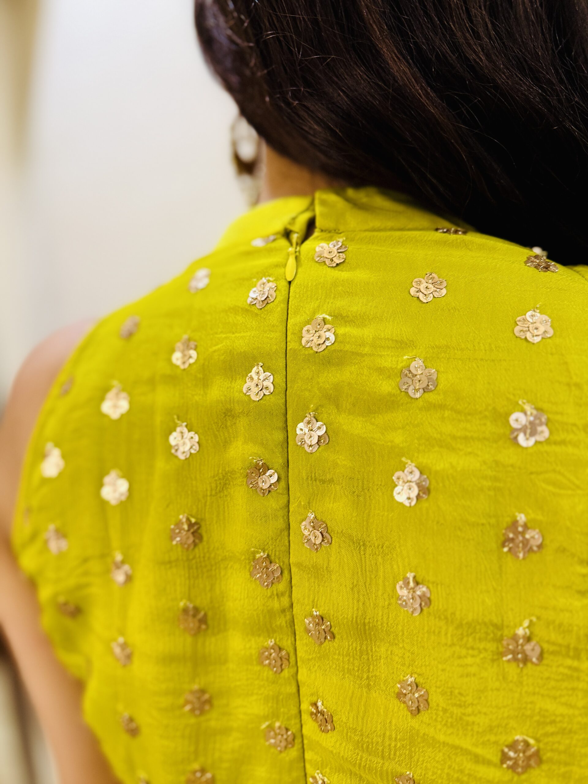 Halter-neck parrot green kurta with delicate sequin florals, paired with flared pants — stitched in a luxe, flowy mashru-silk blend that feels as festive as it looks.