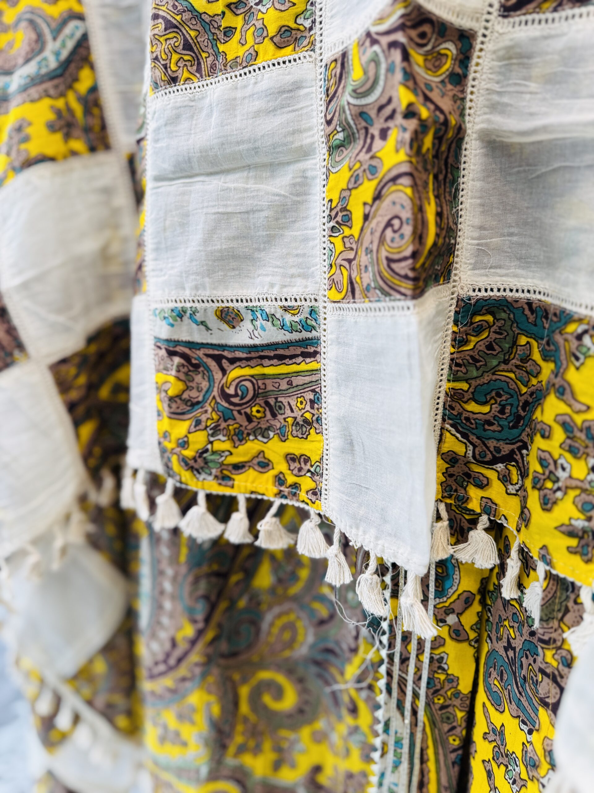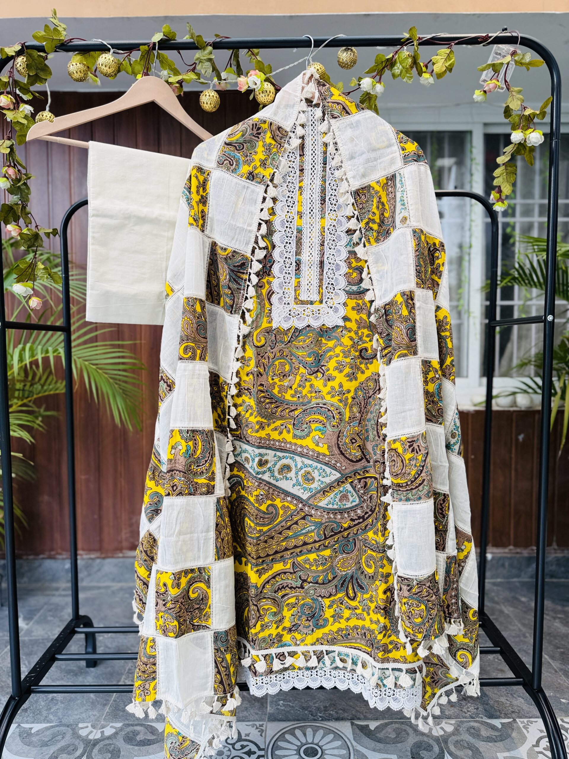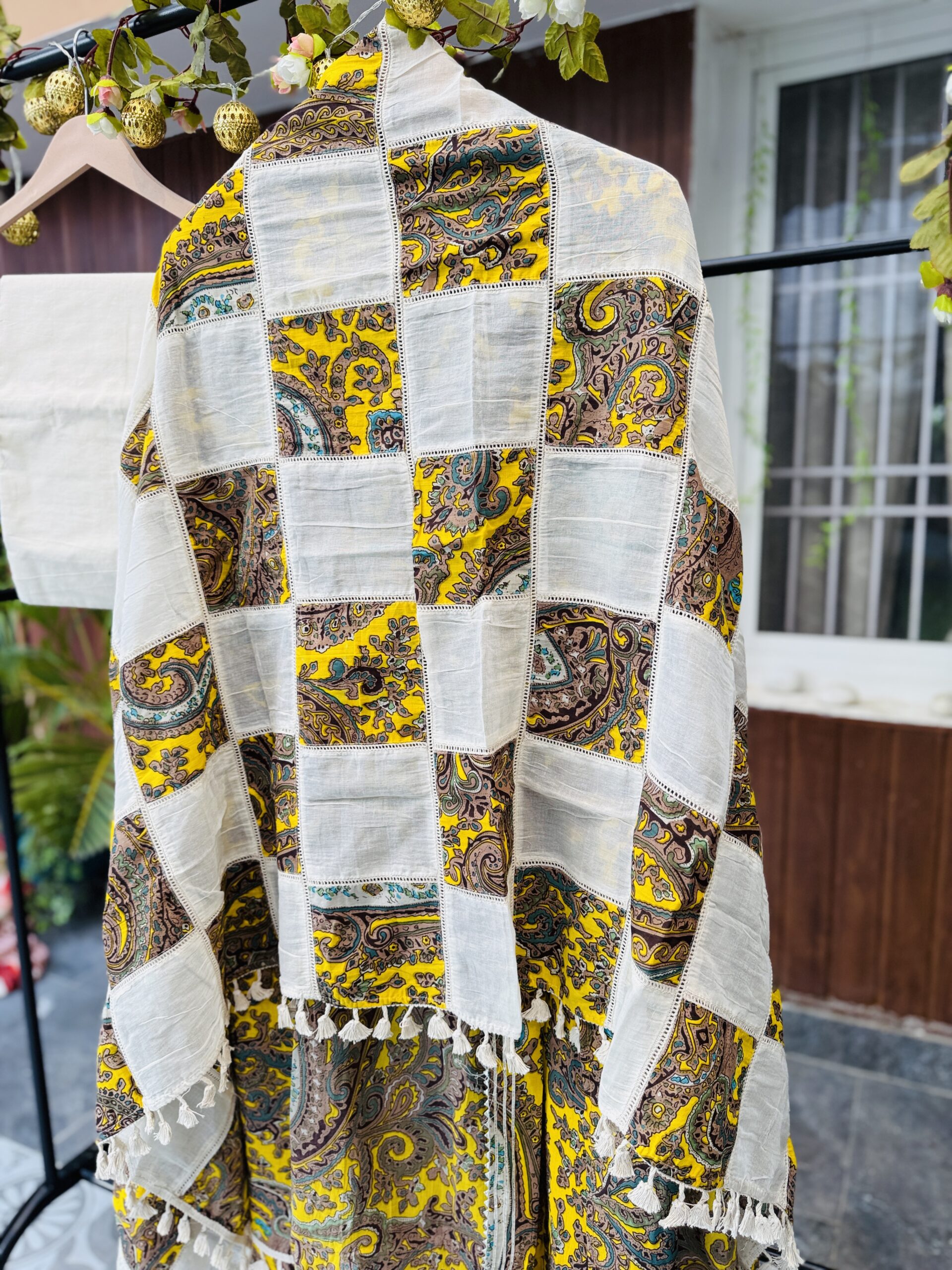 Dupatta: Unique patchwork cotton dupatta combining plain off-white and paisley print blocks, finished with crochet lace, tassels, and delicate threadwork giving it a statement look.