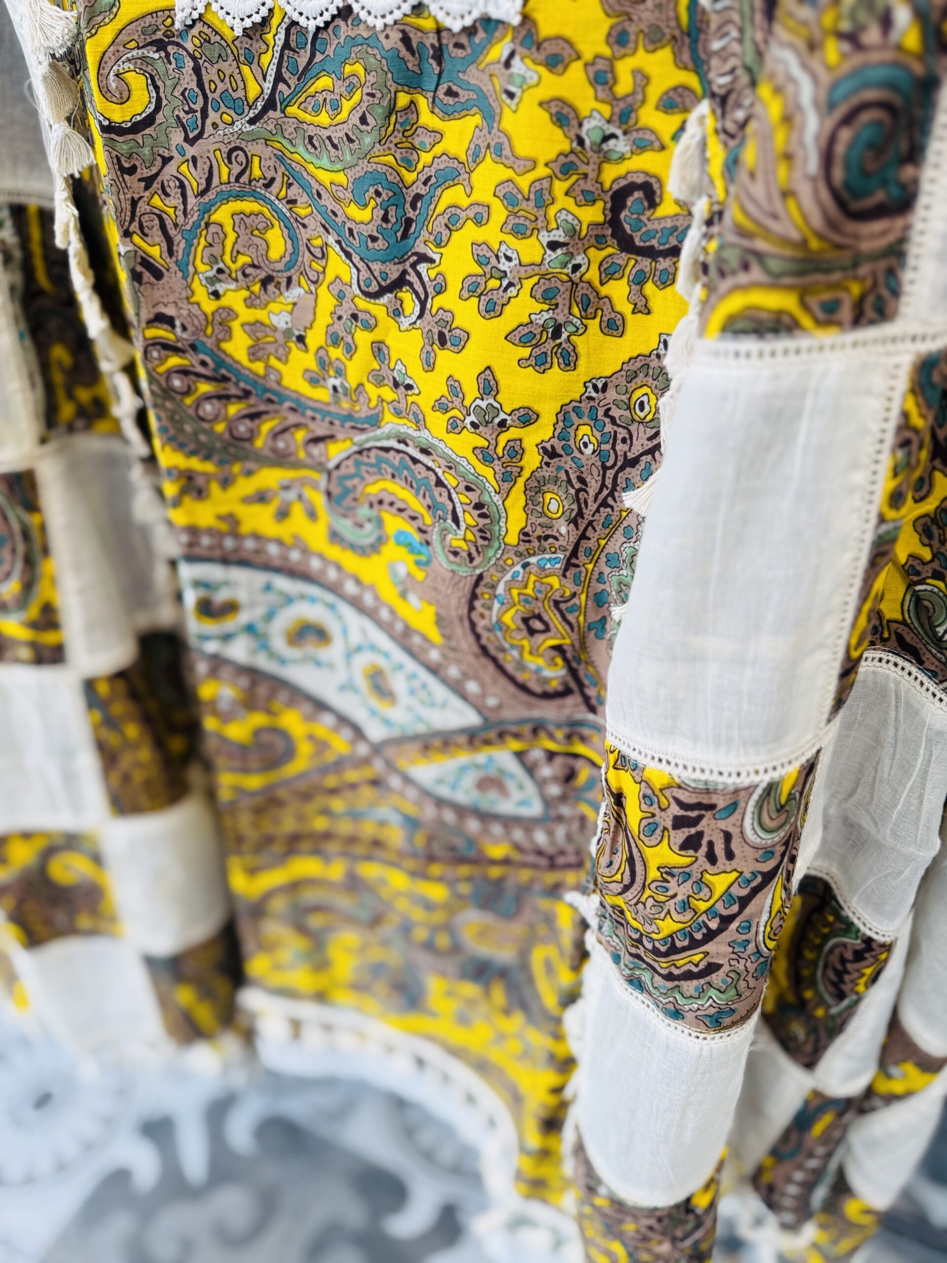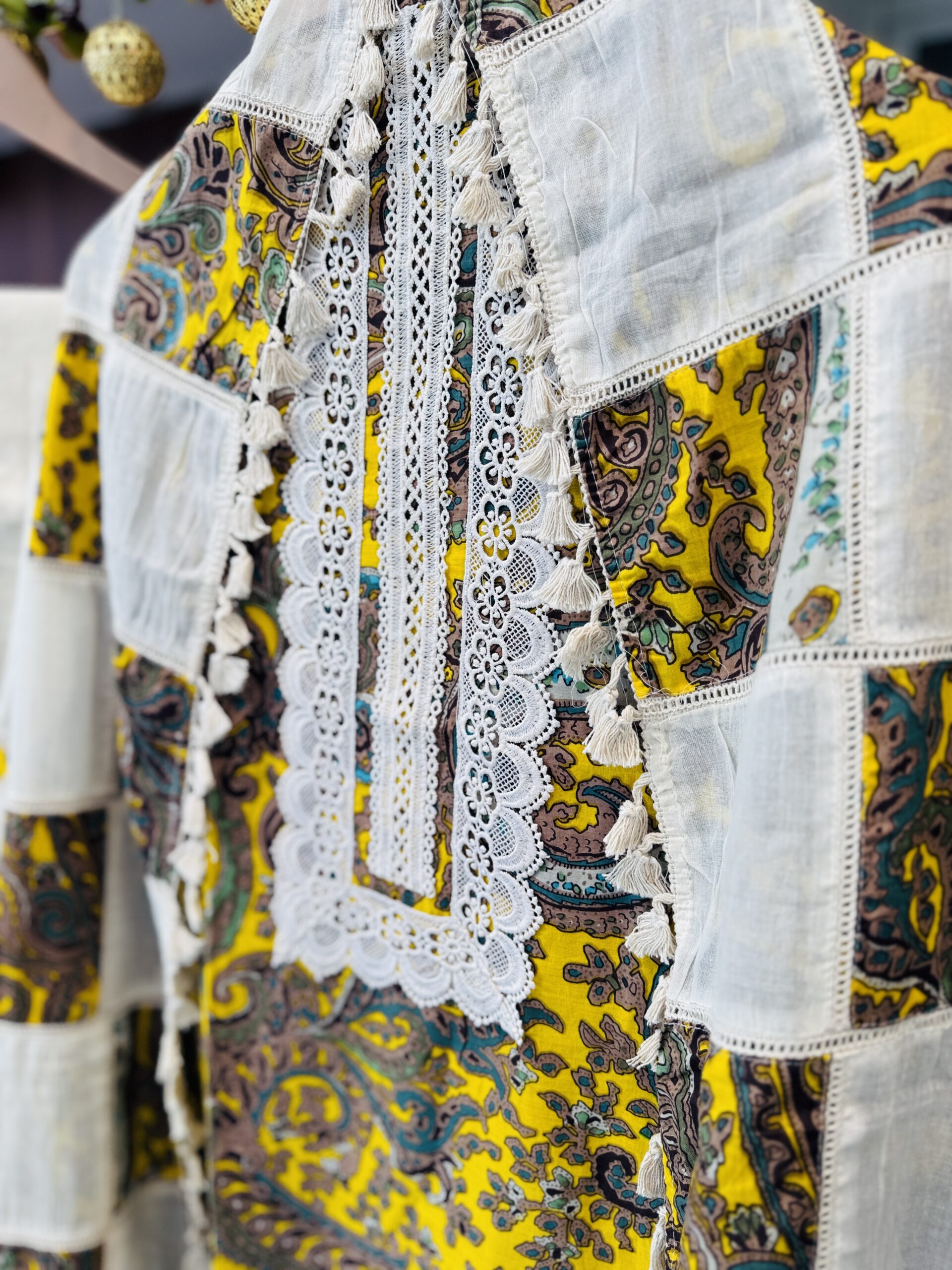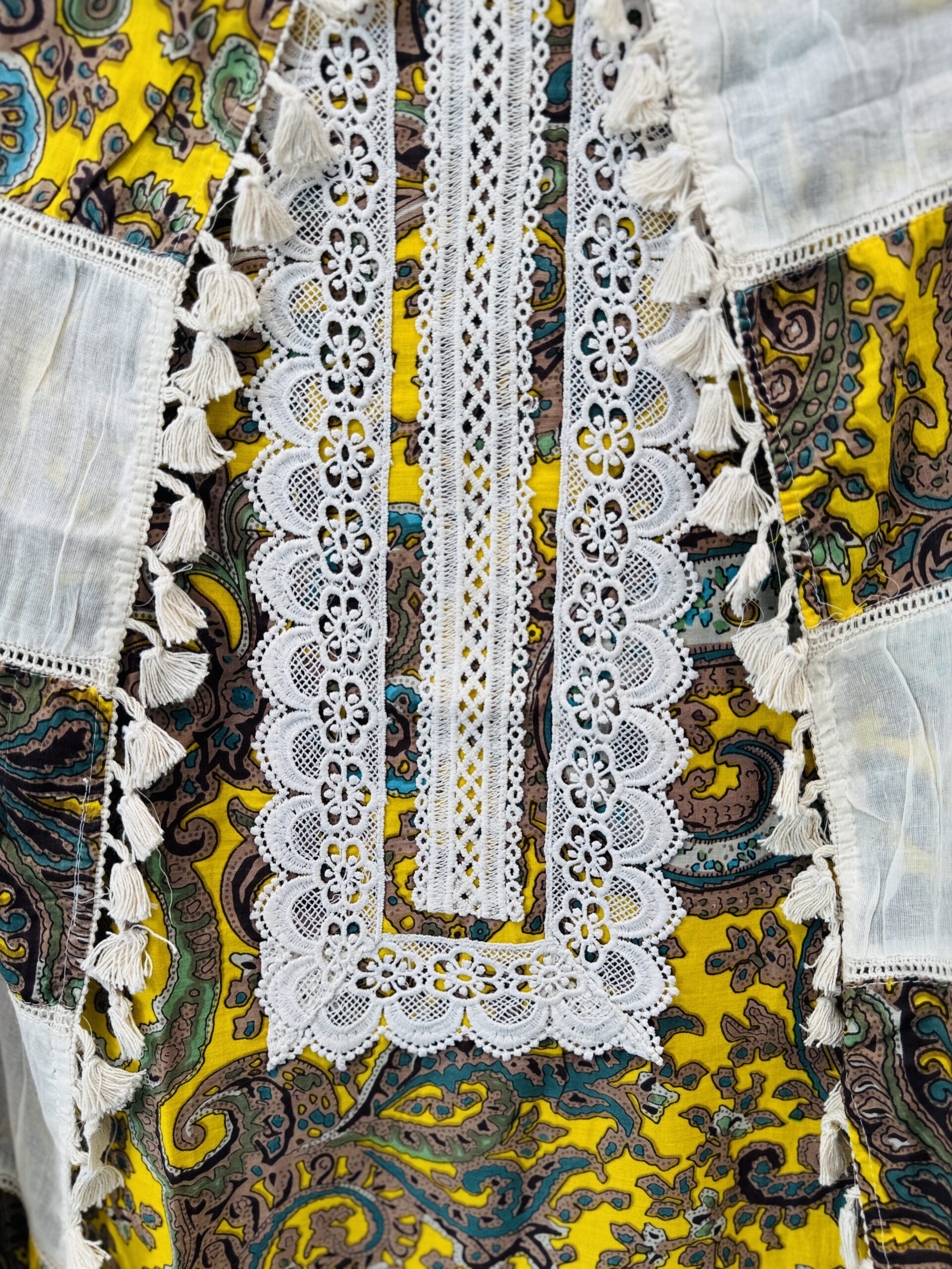 Kurta: Vibrant mustard yellow cotton kurta featuring intricate all-over paisley print in earthy tones of brown, green, and teal. The neckline is beautifully enhanced with white crochet lace and tassel detailing, adding a handcrafted elegance.