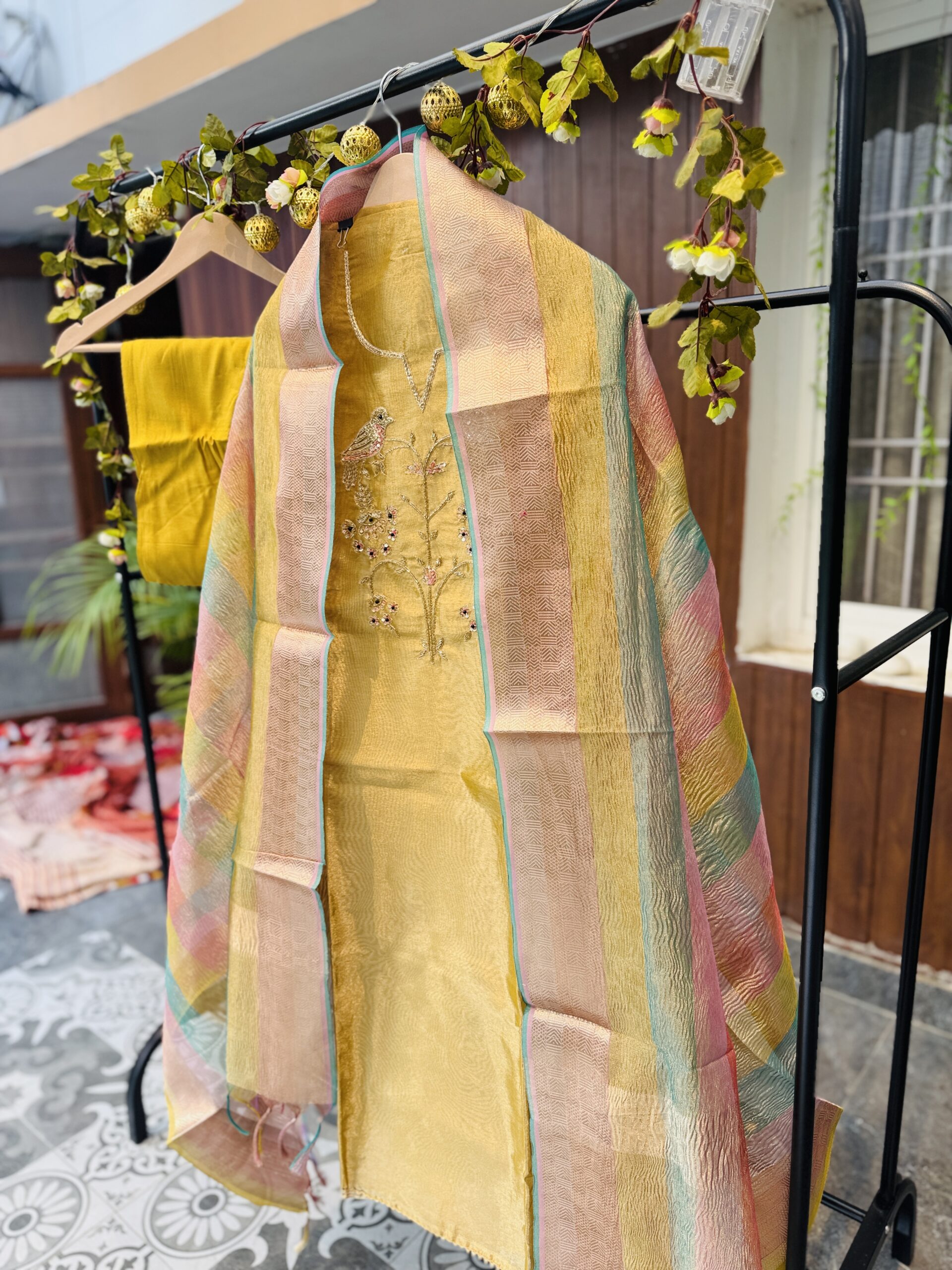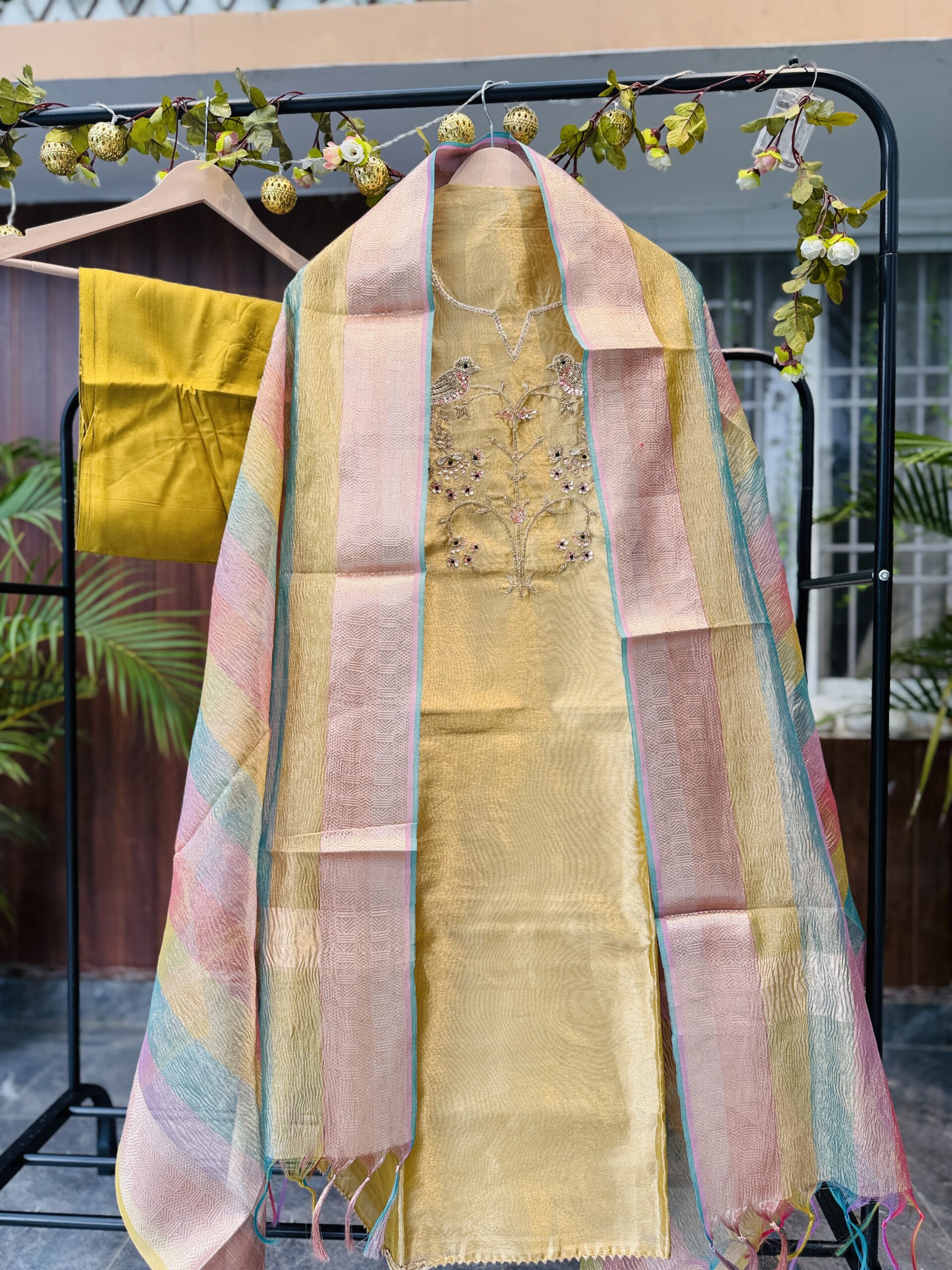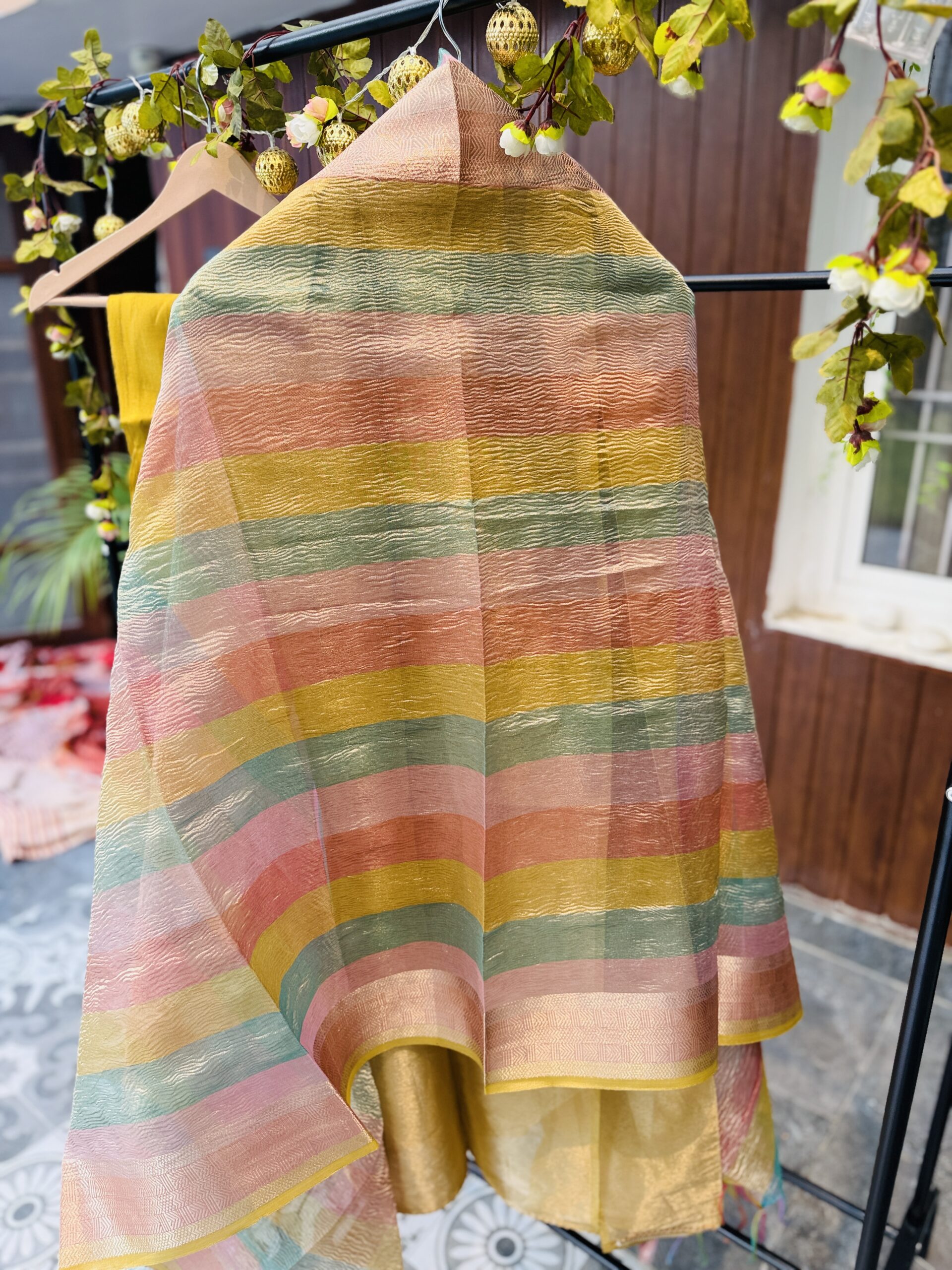 Dupatta: The dupatta is crafted from a matching sheer fabric, likely organza silk, with woven pastel stripes in pink, green, blue, and gold tones. The fabric is semi-transparent, crisp, and light, which are classic qualities of organza silk.