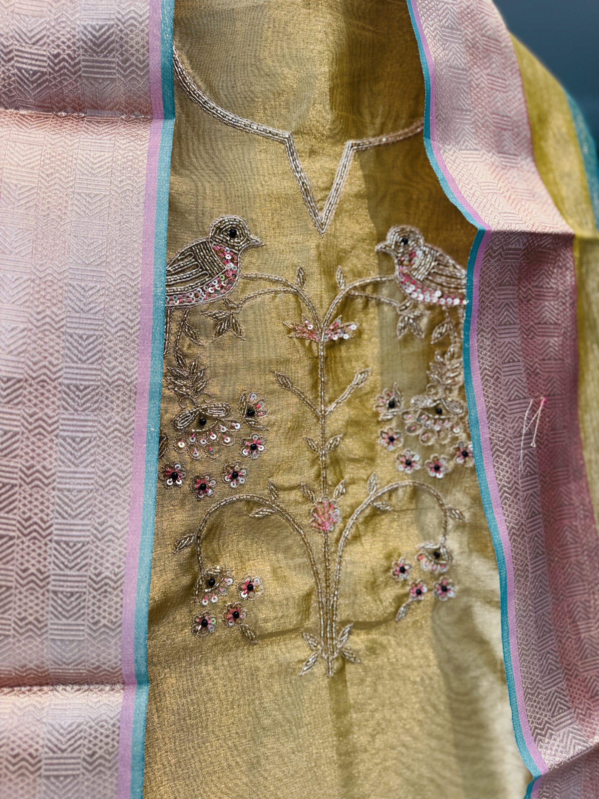 Kurta: The kurta is made from a sheer, glossy fabric with a fine texture and rich olive yellow color. It features hand embroidery using sequins and beads, giving it a sophisticated shimmer typical of organza or tissue silk.