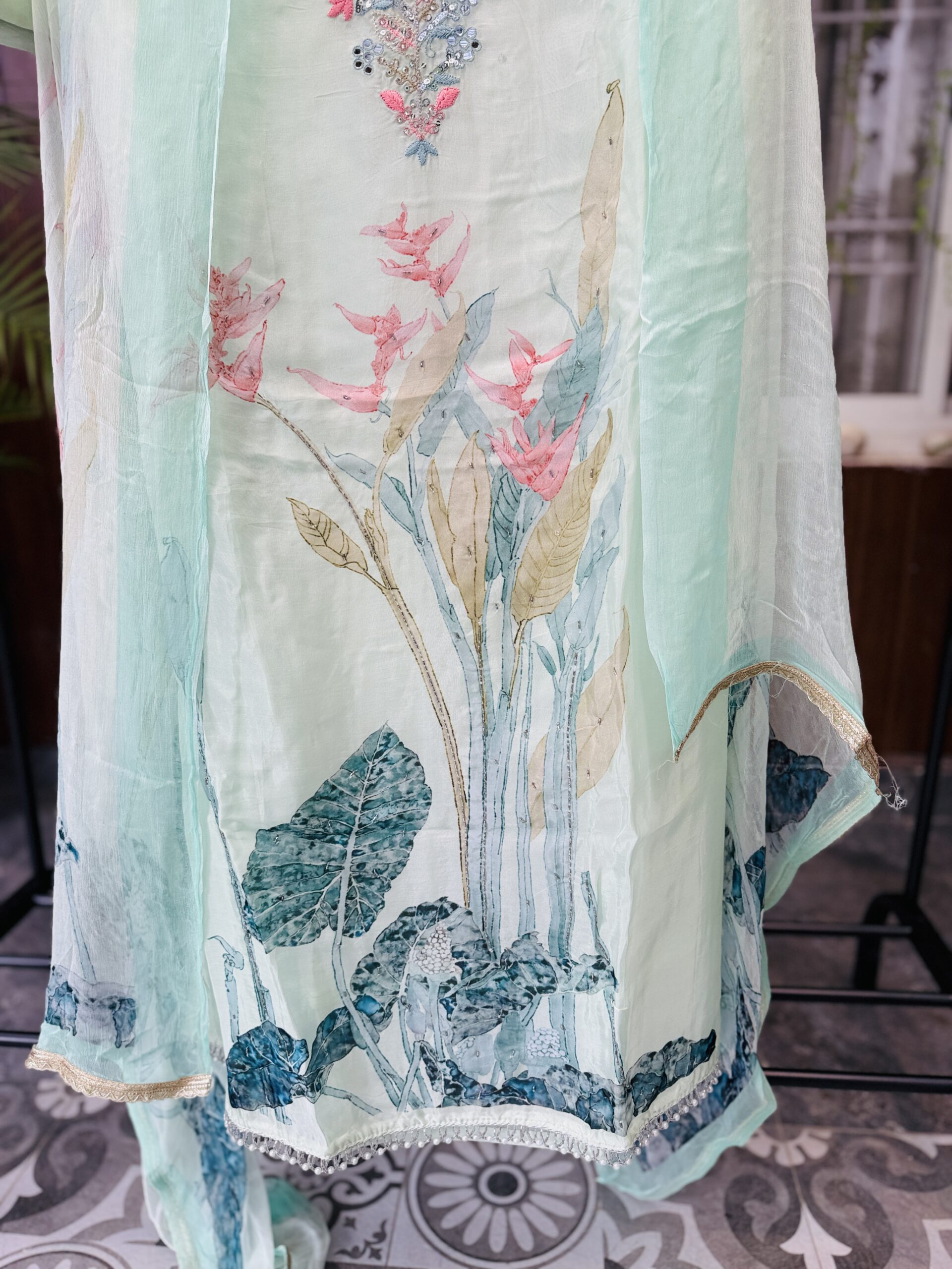 Pastel Mint Green Hand-Embroidered Organza Suit Set