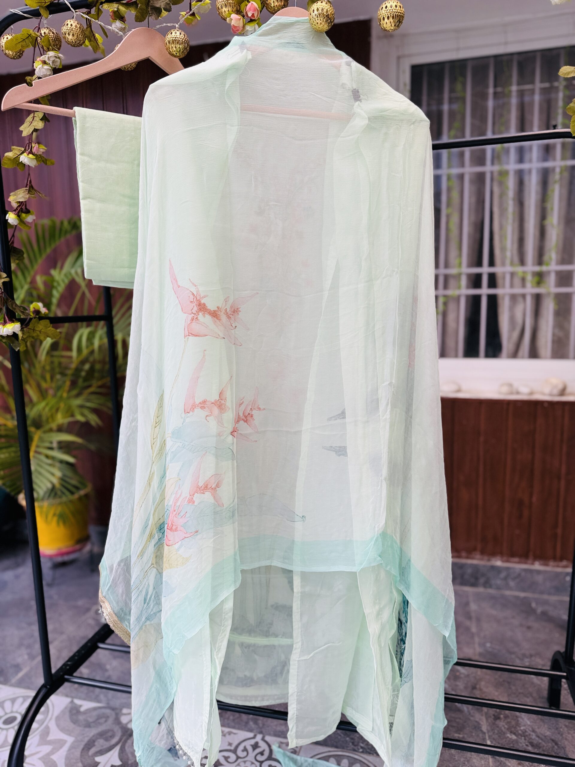 Comes with mint green-blend bottoms and a lightweight printed chiffon dupatta finished with delicate gold edging.