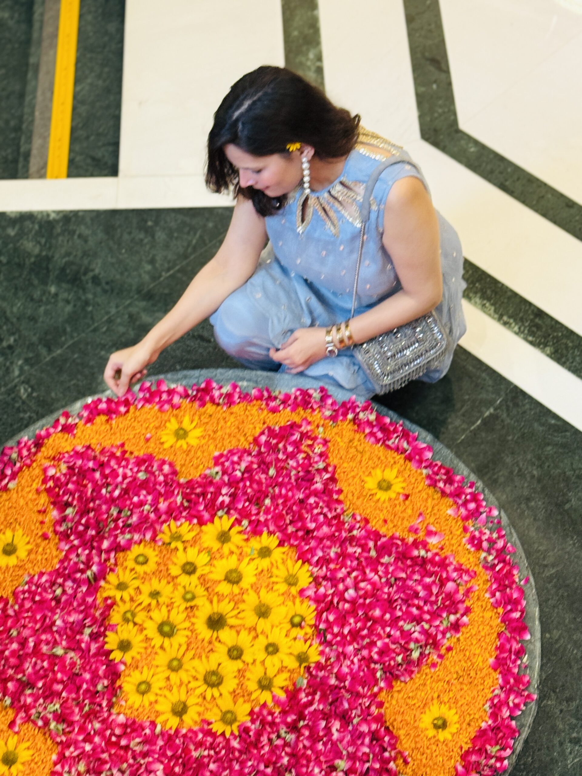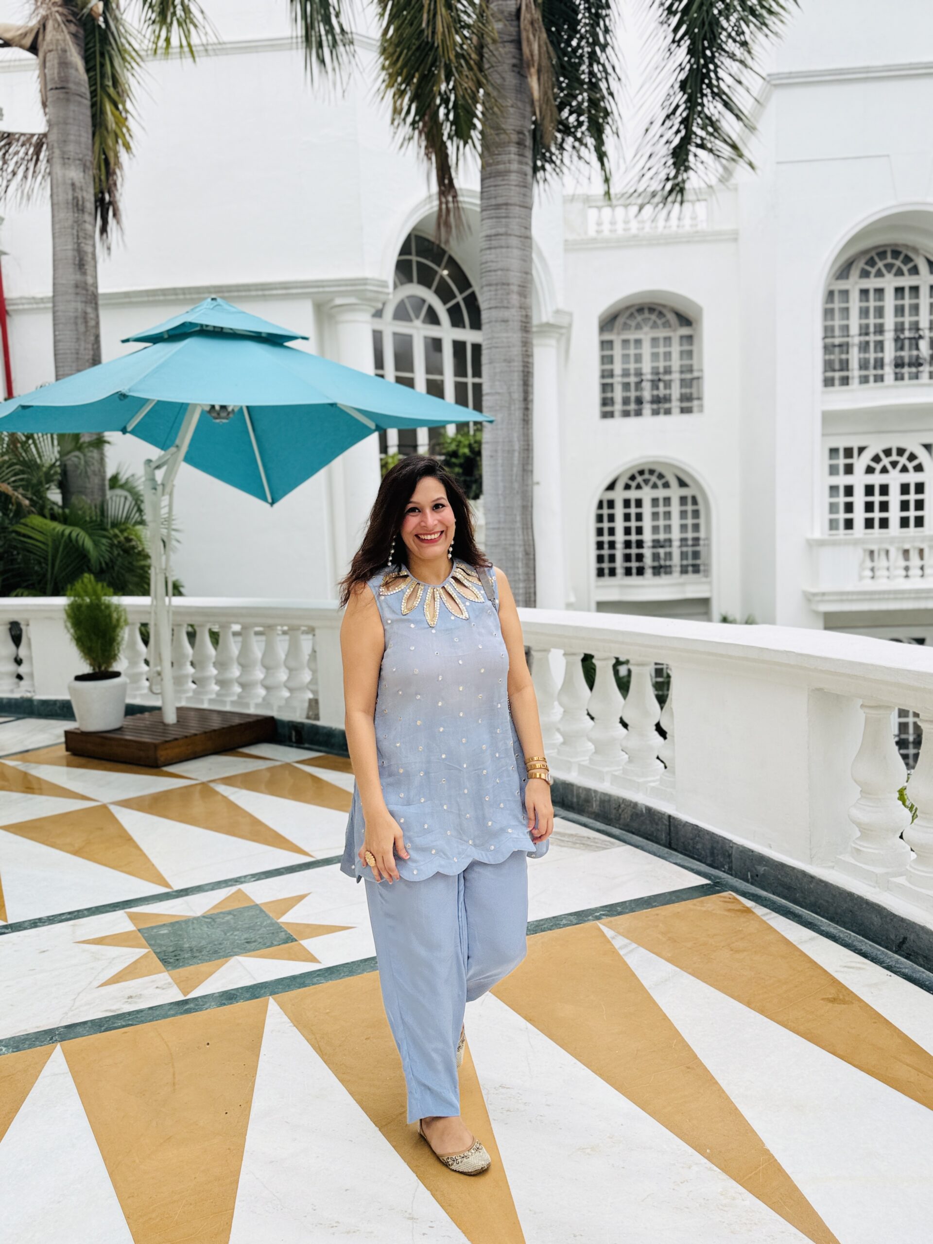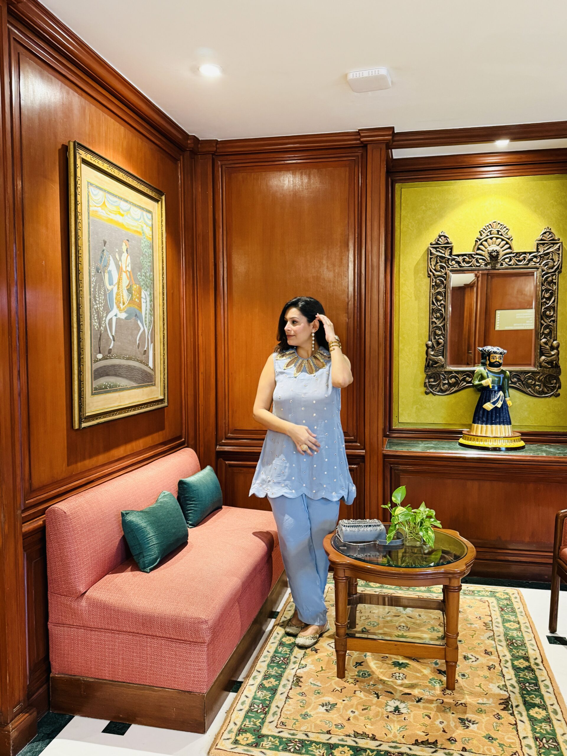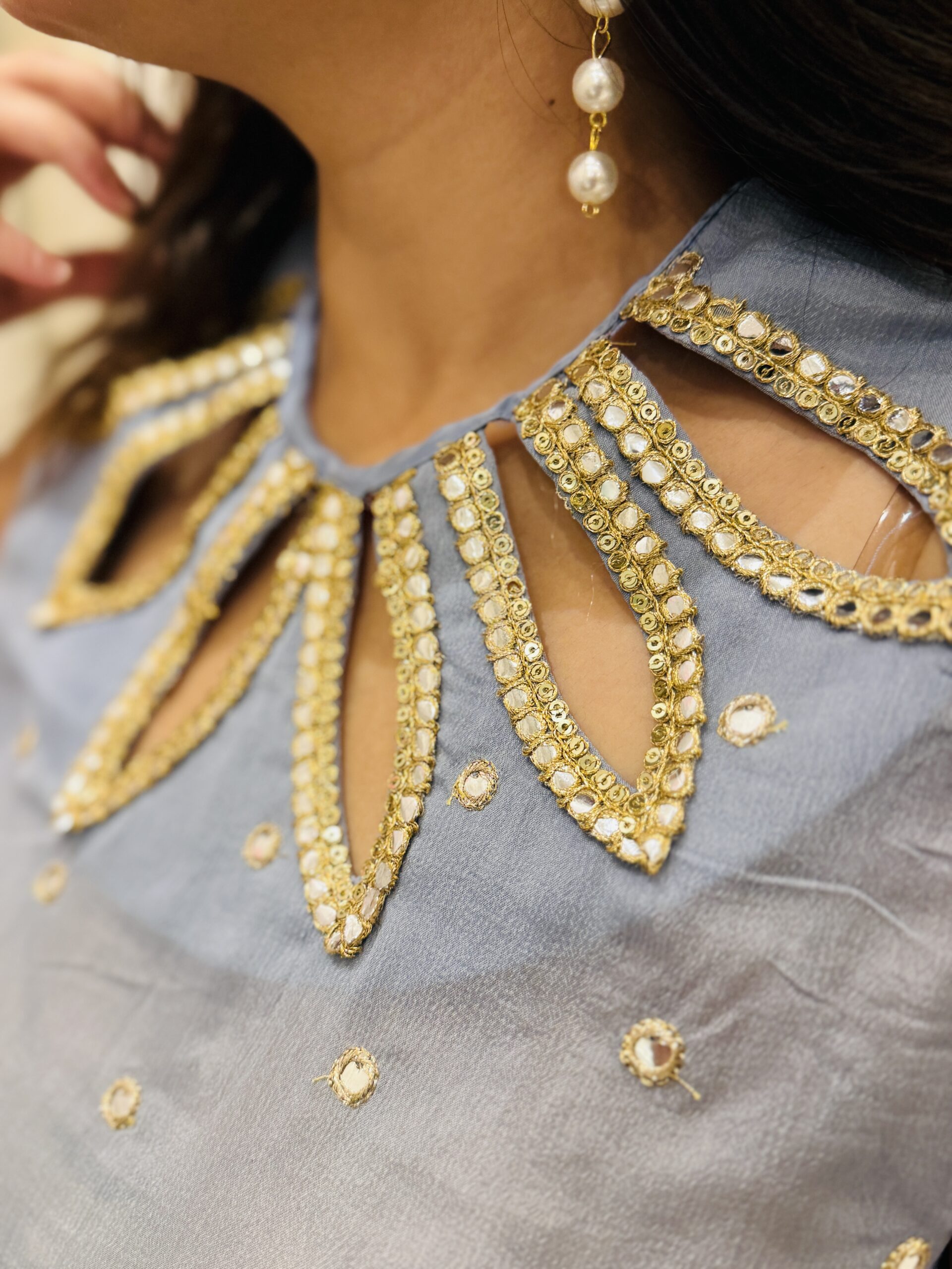 Crafted in chanderi silk, kissed with mirrorwork, and crowned with a handcrafted petal neckline that speaks of quiet glamour.