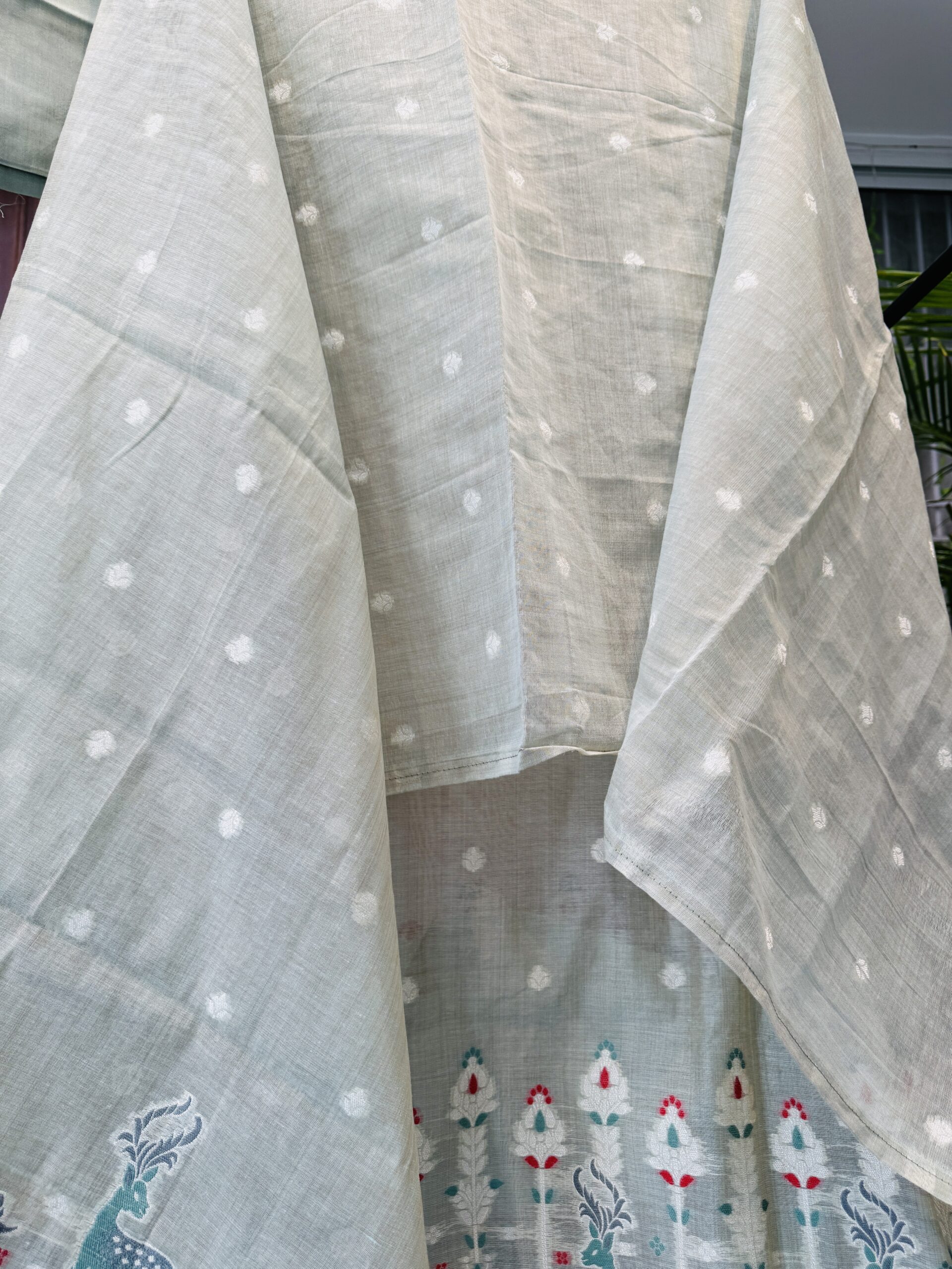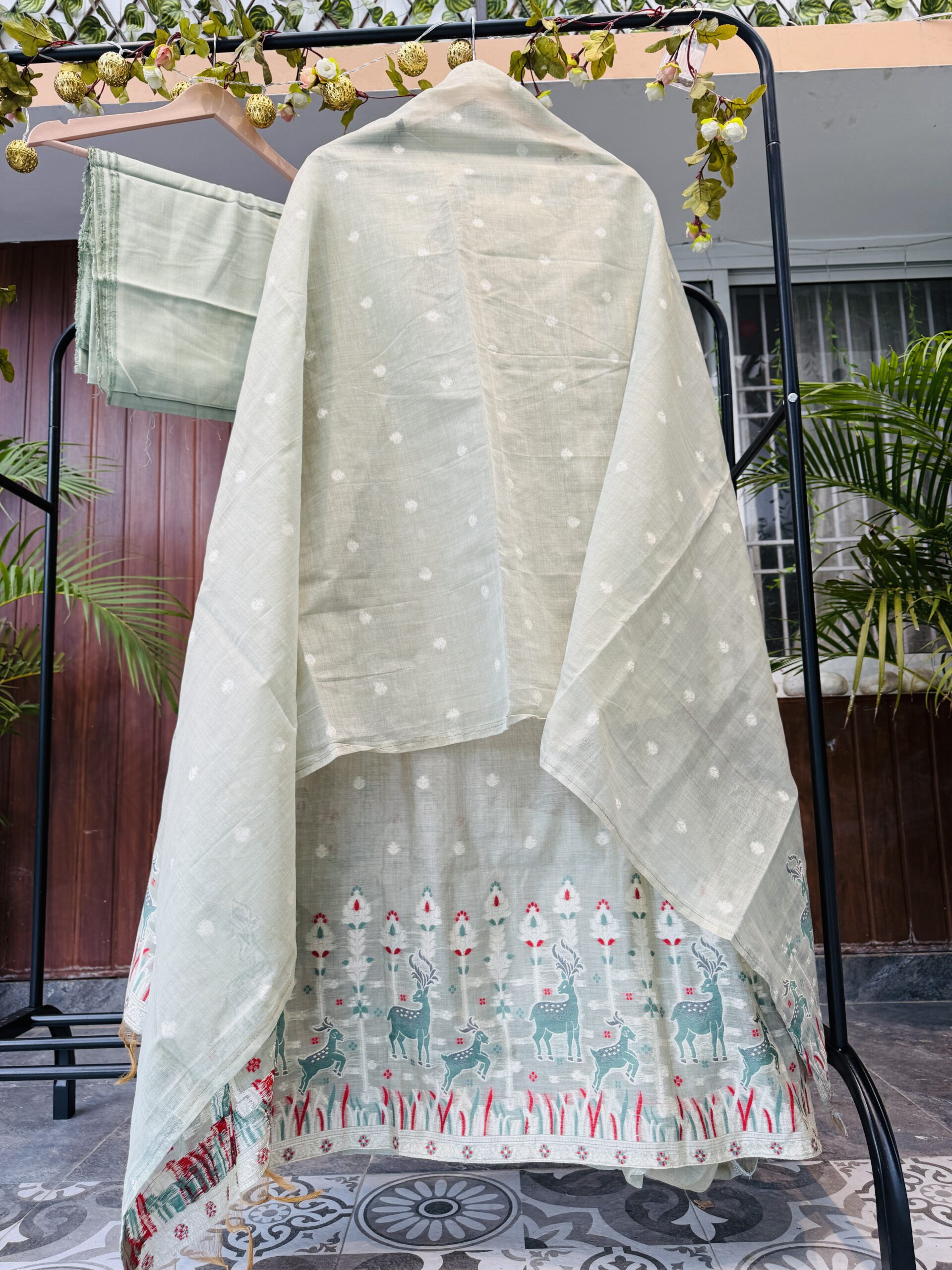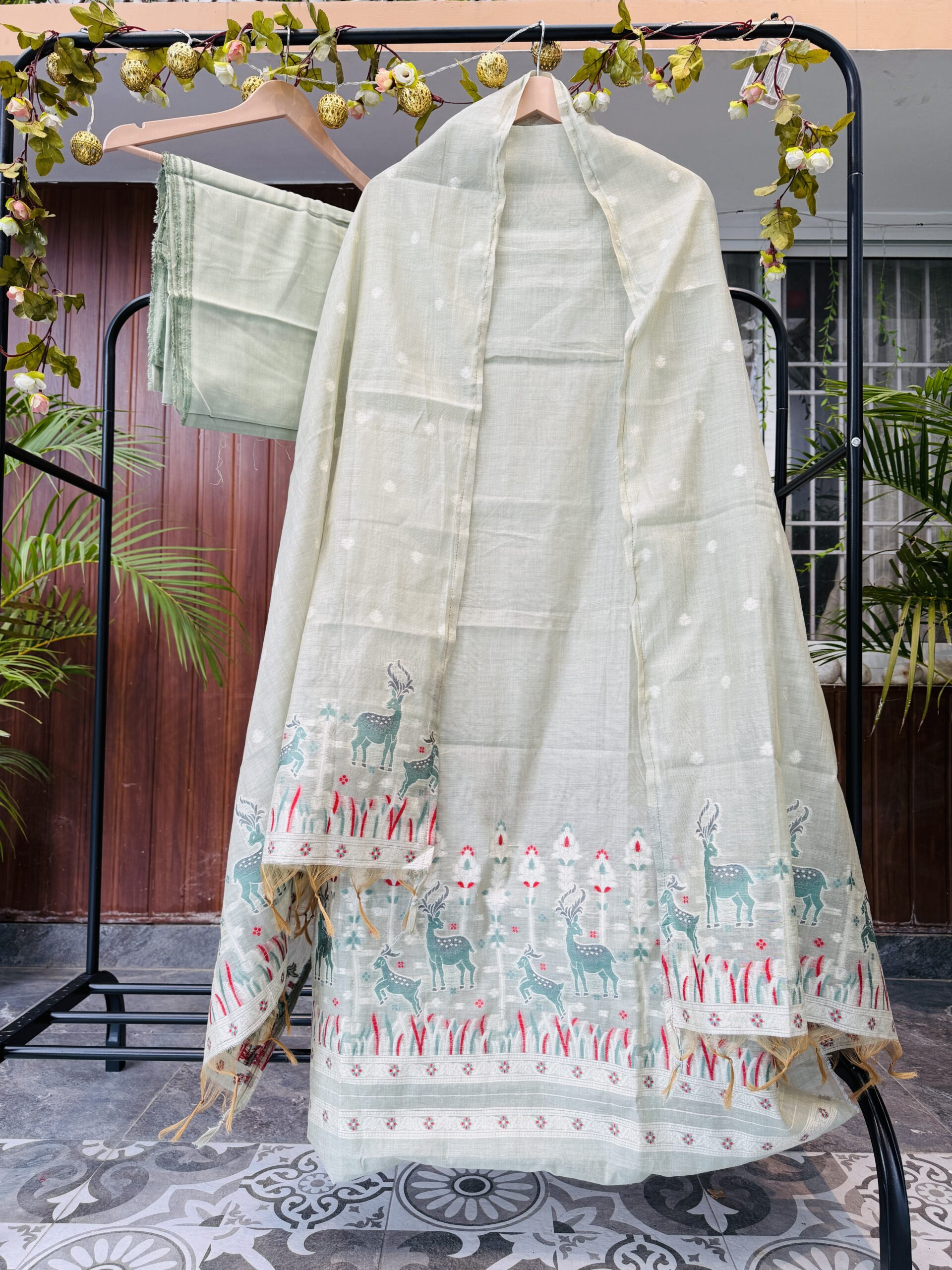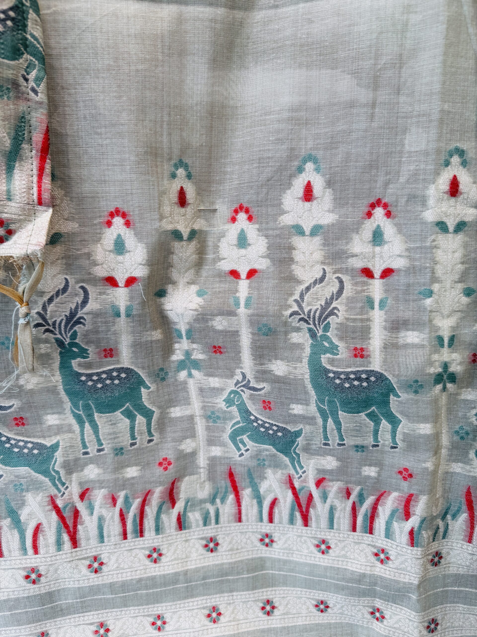 Design: Handwoven pista green base with intricate deer & floral motifs all over.
