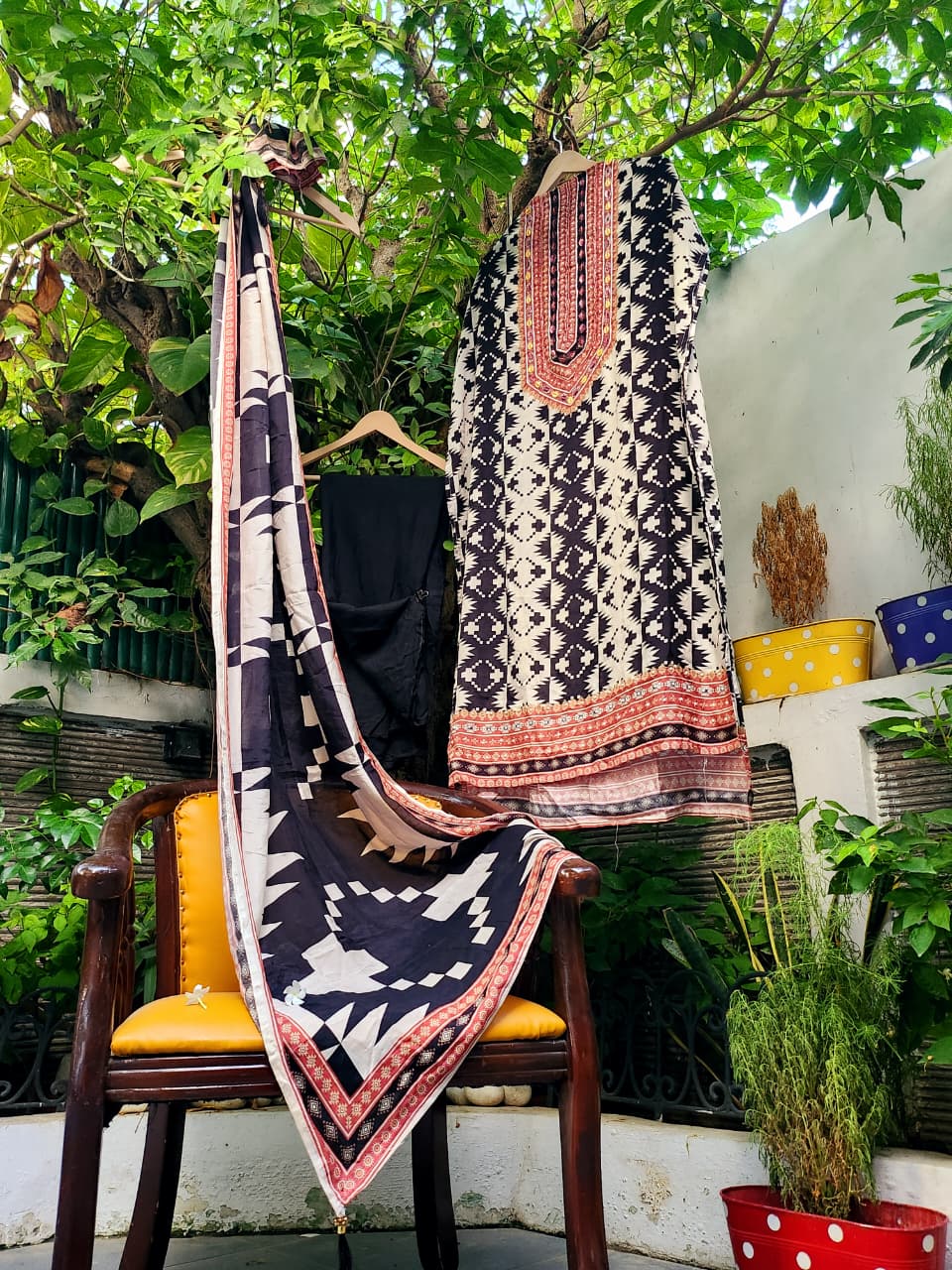Effortlessly soft. Boldly beautiful. Presenting Kaari – a soft cotton suit with tribal symmetry, earthy borders, and soul-soothing comfort. For days when you want to wear art.