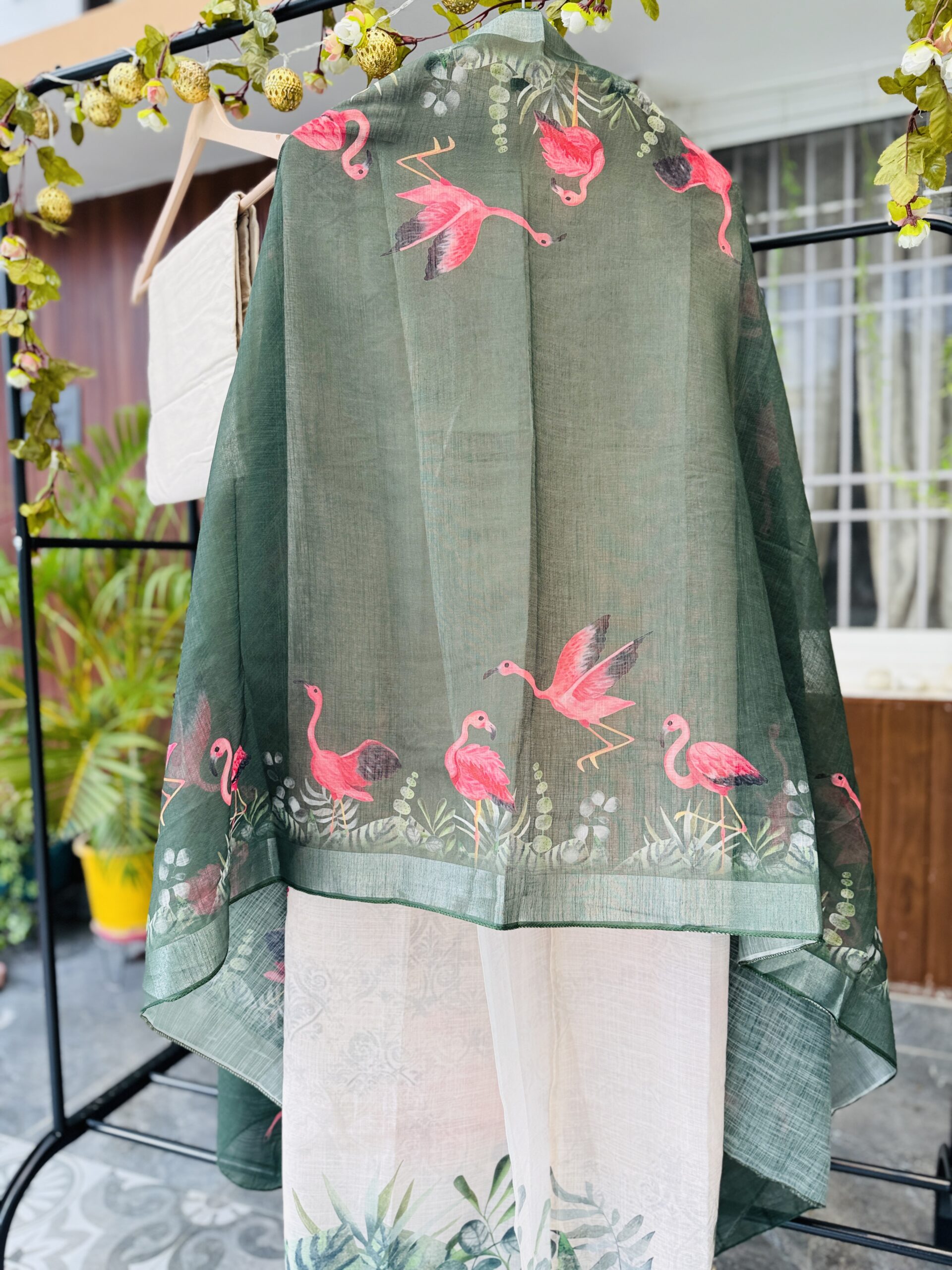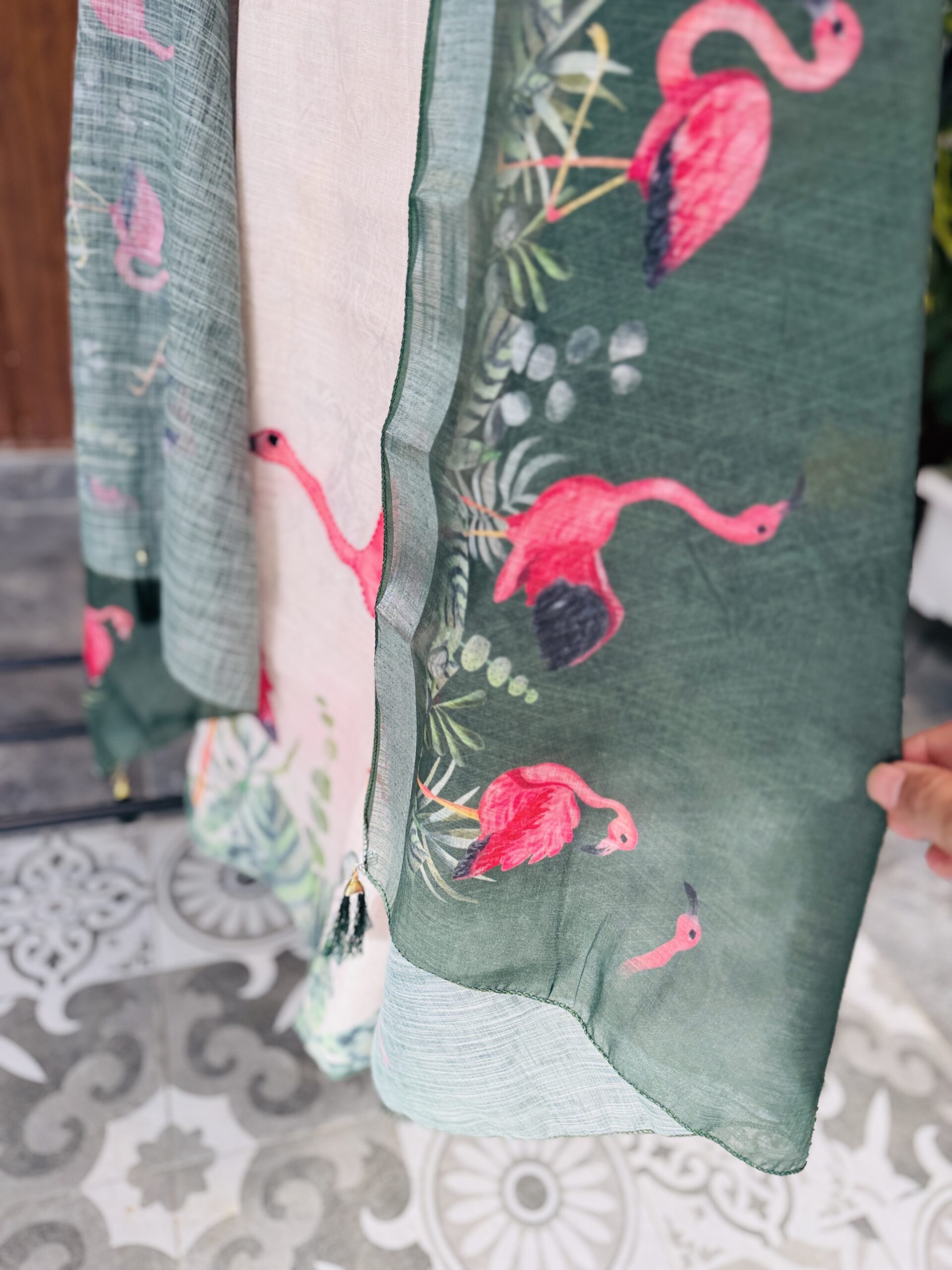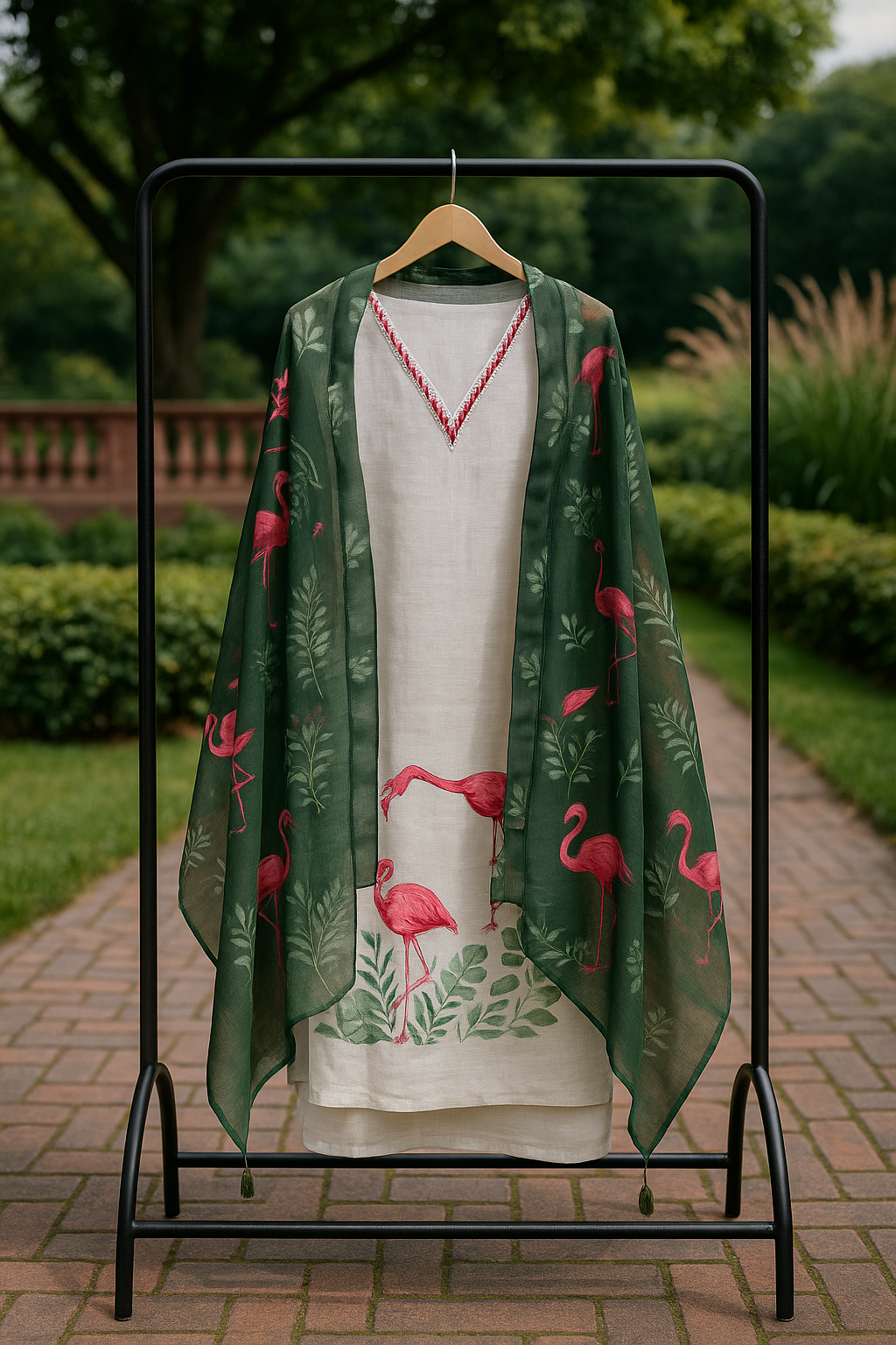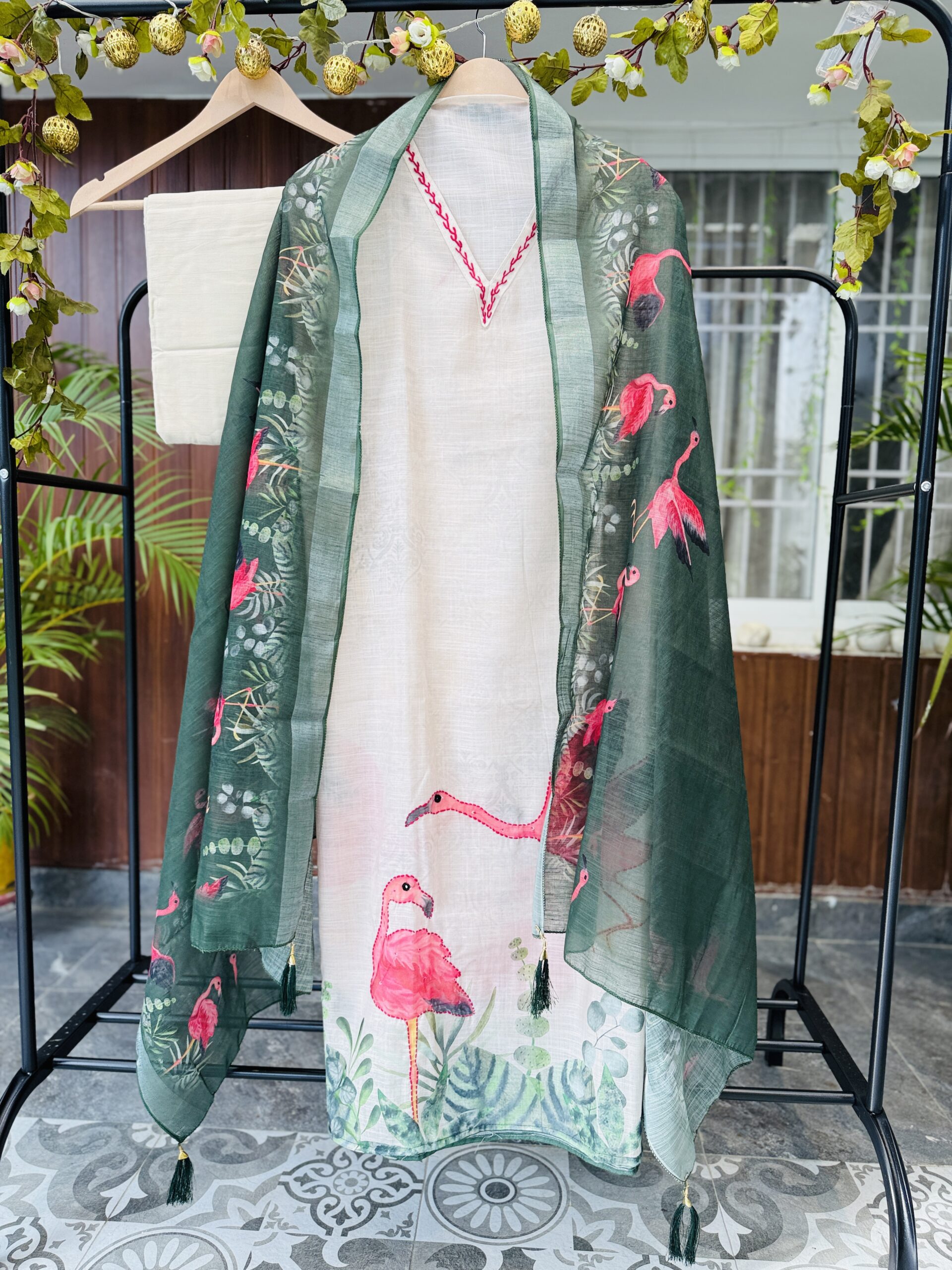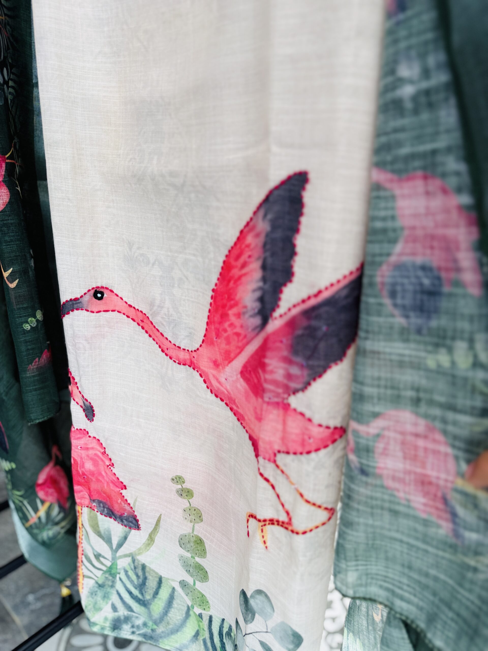 An elegant off-white kurta in soft breathable cotton with a deep V-neckline highlighted by delicate hand embroidery in pink thread and paired with a dark green, lightweight printed dupatta featuring vibrant flamingo and foliage motifs for a refreshing tropical touch. The kurta hemline also carries matching flamingo prints and tiny tassel details for added charm. Paired with cotton-blend off white bottoms.
